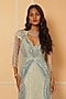 Featuring an ice blue fish-cut gown in net base with nalki hand embroidery. It is paired an embroidered sash. Style this gown with statement earrings and strappy heels for a glamorous cocktail party or evening reception.