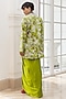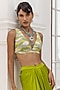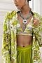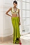 Featuring a lime green jacket in satin organza base with floral motifs, threadwork and hand embroidery. It is paired with a blouse having a plunging neckline and high-waisted flowy skirt. Accentuate it with statement jewellery and heels for a festive occasion, reception, cocktail or mehendi ceremony.
