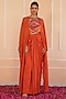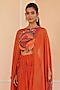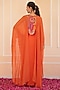 Featuring an orange cape in crepe and organza base. It is paired a multi-colored blouse having patchwork and a draped skirt. Accentuate it with statement earrings and heels, perfect for intimate get-togethers, rakhi celebrations, or low-key festive evenings.
