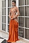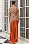 Featuring an orange jacket in raw silk base with hand embroidery. It is paired with a satin draped skirt. Accentuate it with zircon or pearl jewellery and embellished heels for weddings or sangeet ceremony.