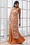 Featuring a warm burnt orange dress in satin organza base with floral motifs embroidery. It is paired with an embroidered cape. Accentuate it with diamond jewellery and heels for a cocktail night, reception, sangeet or engagement ceremony.
