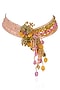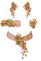 Featuring a gold finish choker necklace studded with multi-colored stones and beads, set in brass. It is paired with a matching pair of earrings, bracelet and ring. Ideal for weddings, festive celebrations or evening occasions.