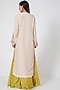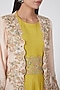 Featuring a yellow crop top in semi crepe base with self quilt work. It is paired with a matching skirt and a blush pink embroidered open jacket.