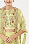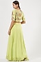 Featuring a mint pre-stitched cape in organza and chiffon base with sequins embroidery. It is paired with a matching skirt and a blouse.