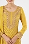 Featuring a mustard pre-stitched kurta in georgette and crepe base with zardosi embroidery. It is paired with a matching gharara and a dupatta.