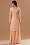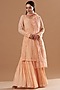 Featuring a peach kurta in georgette base with thread and sequins embroidery. It is paired with matching gharara pants and a chiffon organza dupatta.