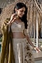 Featuring an ivory and olive green lehenga in tissue base with gold motif embroidery. It is paired with a blouse and an olive green dupatta. Style it with kundan polki jewellery, bold heels and a metallic clutch for a striking edge. Perfect for a destination wedding, sangeet or engagement ceremonies.