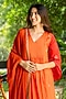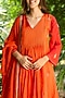 Featuring an orange and red anarkali in upada silk base with a V-neckline and embroidery. It is paired with pants and a dupatta. Style with polki jewellery, soft curls and heels for festive occasions, weddings or sangeet ceremonies.