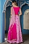 Featuring a pink blouse in viscose chinnon and blended fabric base with an attached dupatta. It is paired with a matching lehenga having hand tie-dye, lace, and gota embroidery.