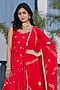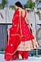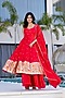 Featuring a red anarkali in silk base with embroidery. It is paired with a floral palazzo and a dupatta. Style with polki jewellery, soft curls and heels for festive occasions, weddings or sangeet ceremonies.
