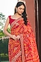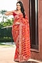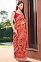 Featuring a red saree in viscose rayon base with print. It is paired with an unstitched blouse piece. Accentuate it with gold drop earrings, a potli bag and strappy heels for a wedding or a sangeet ceremony.