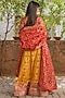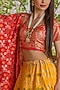 Featuring a yellow banarasi lehenga in brocade and silk base with lace detailing and a can-can. It is paired with a contrasting crimson red blouse and a dupatta.