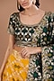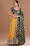 Featuring a yellow banarasi lehenga in brocade base with can-can and lace embellished hem. It is paired with a bottle green blouse having half sleeves and a scoop neckline, including a dupatta.