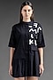 Featuring a black pleated shirt dress in cotton base with alphabetic applique detail and a mandarin collar.