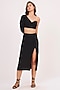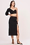 Featuring a black one-shoulder top in muslin base. It is paired with a matching skirt having thigh-high slit.