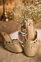 Featuring a pair of beige mule heels in silk base with pearls, mirror, cutdana beads embellishments. It has a suede underlining, PU sole and 2-inch heels. Perfect wear for a wedding or festive occasion.