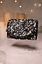 Featuring a black clutch bag in chantilly base with tassels, crystals and rhinestone embroidery. It has a suede lining. Perfect for festive occasions or wedding ceremonies.