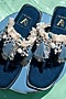 Featuring a pair of blue T-strap flats in textured satin base with tassel work and shell embroidery. It has a vegan leather underlining.