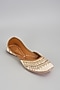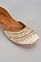 Featuring a pair of cream juttis in silk base with zari, beads, dabka, cutdana and bead work. It has a faux leather lining, double cushioning insole and 0.5-inch heels. Step into luxury and make a statement with every step in these meticulously crafted and opulent heels.