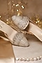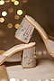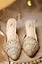 Featuring a pair of gold mule heels in shimmer banana crepe and faux leather base. Elevate your stride with timeless elegance and exceptional craftsmanship, perfect for any occasion.