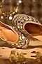 Featuring a pair of gold juttis in silk base with mirror and gold embroidery. It has a leather underlining and a leather sole. Perfect wear for a wedding or festive occasion.