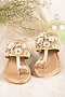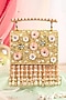 Featuring a pair of gold kolhapuri sandals in textured silk base with beads, pearl drops, pearl and glass beads hand embroidery, having a leather underlining. It comes with a matching embroidered clutch having a suede lining.