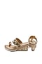 Featuring a pair of golden wedges in textured fabric base with beads, bugle beads, sequins, and cutdana embellishments. It has a leather underlining, pure leather sole, and 3 inch heels.