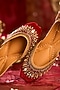 Featuring a pair of red juttis in velvet base with cutdana, sequins, mirror, zari, dabka and beads hand embroidery. It has a leather underlining and a leather sole. Perfect wear for a wedding or festive occasion.