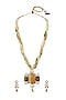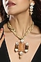 Featuring a gold finish necklace studded with moissanite kundan polki, agate, tumbles, micro balls and cubic zirconia, set in brass. It is paired with a matching pair of earrings. Perfect to wear with Indian, Indo-western, as well as western outfits, a beautiful fusion of modern and traditional jewellery.