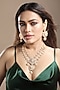 Featuring a gold finish long necklace studded with pearls, moissanite kundan polki and cubic zirconia, set in brass. It is paired with a matching pair of earrings. Perfect to wear with Indian, Indo-western, as well as western outfits, a beautiful fusion of modern and traditional jewellery.