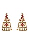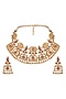 Featuring a gold finish necklace studded with moissanite kundan polki, mother of pearls and synthetic ruby, set in brass. It is paired with a matching pair of earrings. Perfect to wear with Indian, Indo-western, as well as western outfits, a beautiful fusion of modern and traditional jewellery.