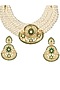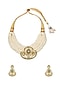 Featuring a micron gold finish handcrafted choker necklace studded with kundan polki, agates, onyx and tumbles, set in brass. It is paired with a matching pair of earrings.