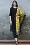 Featuring a black kurta in linen satin base with french knot and kantha embroidery. It is paired with pants and a mustard tie-dye ikat printed stole. Accentuate with statement earrings and heels for festive gatherings.
