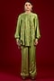 Featuring a green shirt in linen satin base with floral and french knot embroidery. It is paired with pants. Style it with statement earrings, soft curls and block heels, perfect for an evening look.