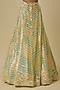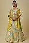 Featuring a green and mustard lehenga in silk shantoon, japanese silk satin and hard net base. It is paired with a blouse and a dupatta-style cape. Accentuate it with diamond jewellery and block heels for sangeet, haldi ceremonies or weddings.