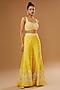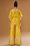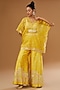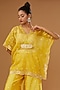 Featuring a mustard bohemian kaftan in silk organza base with hand embroidery. It is paired with a bustier, a belt and raw silk sharara pants having applique, cutdana and sequins hand embroidery. Accentuate it with a clutch and heels for festive occasions.