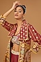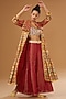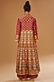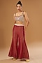 Featuring a red anarkali jacket in silk zari blend base with floral hand print. It is paired with a raw silk hand-embroidered bustier and palazzo pants having mirror and sequin embellishments. Accentuate it with a clutch and flats for pre-wedding ceremonies.