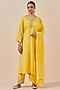 Featuring a yellow kurta in chanderi silk base with hand and machine embroidery. It is paired with matching pants and a tissue dupatta.