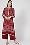 Featuring a maroon long kurta in silk bandhani base with sleeves detailing. It is paired with matching pants.