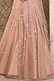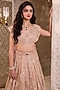 Featuring a champagne lehenga in satin and organza base with hand embroidery and cancan. It is paired with a georgette blouse and a belt. Accentuate it with statement earrings and heels for a wedding or engagement ceremony.