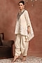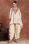 Featuring a cream top in linen base, adorned with foil work and a hand-embroidered yoke. It is paired with matching linen cowl pants. Style this pant set with some statement minimal jewellery, a sling bag, and heels to add a touch of glamour.