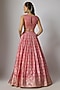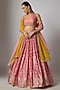 Featuring a blush pink lehenga in woven silk brocade base with zari motifs detailing. It is paired with a hand embroidered blouse and an organza embellished dupatta. Accentuate it with kundan polki jewellery, a floral hair bun and block heels for a complete look, perfect for wedding or engagement ceremonies.