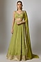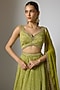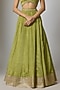 Featuring a lime green lehenga in crepe and georgette base, adorned with bandhani print, hand and machine embroidery. It is paired with a blouse and an embroidered dupatta. This ensemble is perfect for mehendi, sangeet and wedding celebrations.