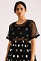 Featuring an black dress in cotton base with polka dot print and organza detailing. It is paired with a matching silk organza crop top.