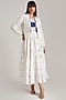Featuring an ivory and blue gathered dress in handwoven jamdani base with strap, shawl collar, scallops and geometric pattern detailing. It is paired with a matching jacket and a belt.