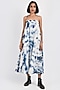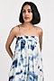 Featuring a white and blue midi dress in handwoven ikat base with side pockets, noodle straps, and a back zipper.