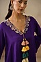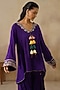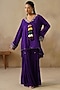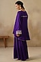 Featuring a purple high-low jacket in cotton silk base with metal coins, dori and thread embroidery. It is paired with gharara pants. Accentuate it with statement jewellery and heels, ideal for festive occasions or family gatherings.