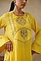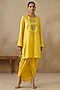 Featuring a yellow straight shirt top in cotton silk base with metal sequins, ghungroos, tassels, dori and thread embroidery. It is paired with a draped skirt. Accentuate it with statement jewellery and heels, ideal for festive occasions or diwali parties.