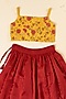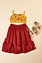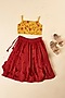 Featuring a maroon frilled lehenga for girls in silk base. It is paired with a yellow top having floral embroidery. Style it with sandals and cute hair accessories for festive occasions or wedding ceremonies.