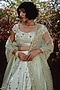 Featuring a sea green lehenga in raw silk base with floral hand embroidery. It is paired with a matching embroidered blouse and a net stole.